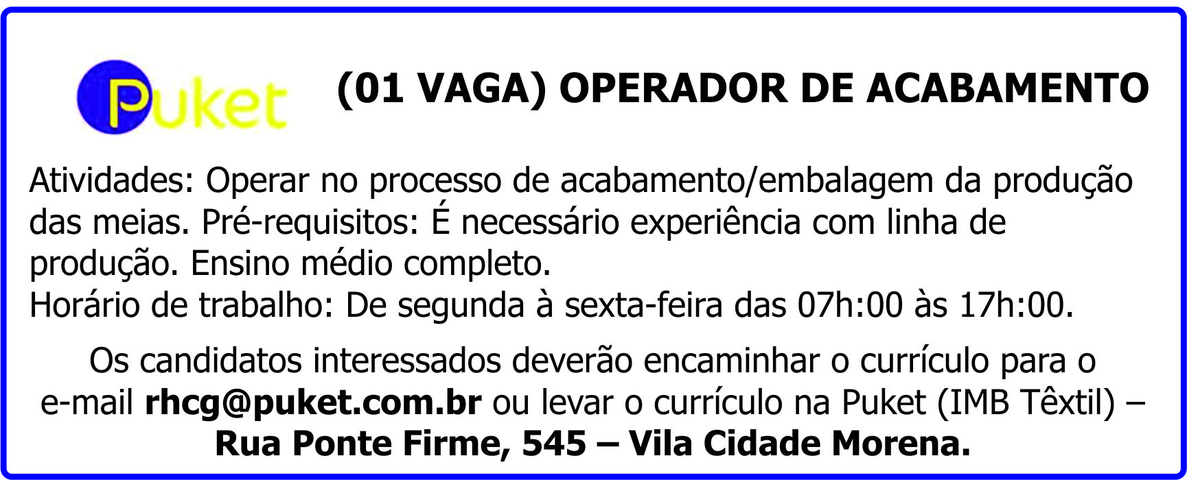 Os candidatos interessados deverão encaminhar o currículo para o e-mail [email protected] ou levar o currículo na Puket (IMB Têxtil) – Rua Ponte Firme, 545 – Vila Cidade Morena.