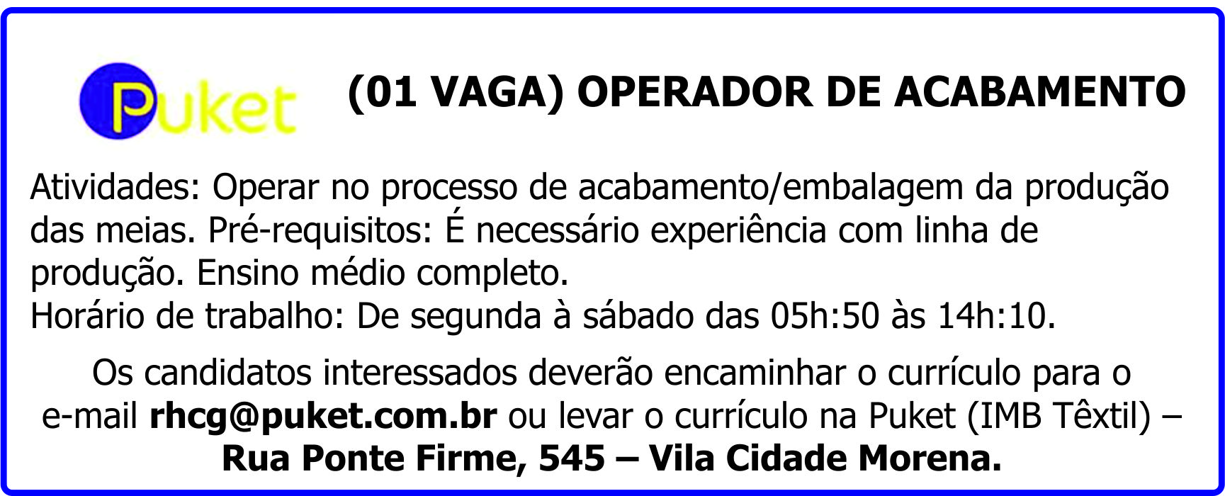 Os candidatos interessados deverão encaminhar o currículo para o e-mail [email protected] ou levar o currículo na Puket (IMB Têxtil) – Rua Ponte Firme, 545 – Vila Cidade Morena.