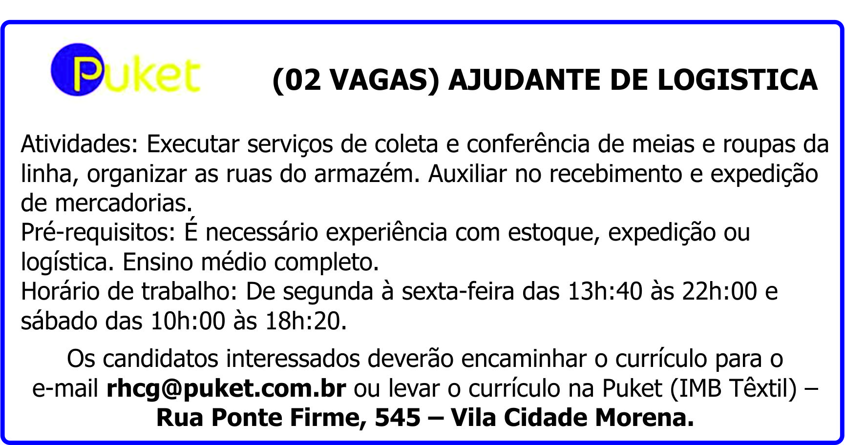 Os candidatos interessados deverão encaminhar o currículo para o e-mail [email protected] ou levar o currículo na Puket (IMB Têxtil) – Rua Ponte Firme, 545 – Vila Cidade Morena.