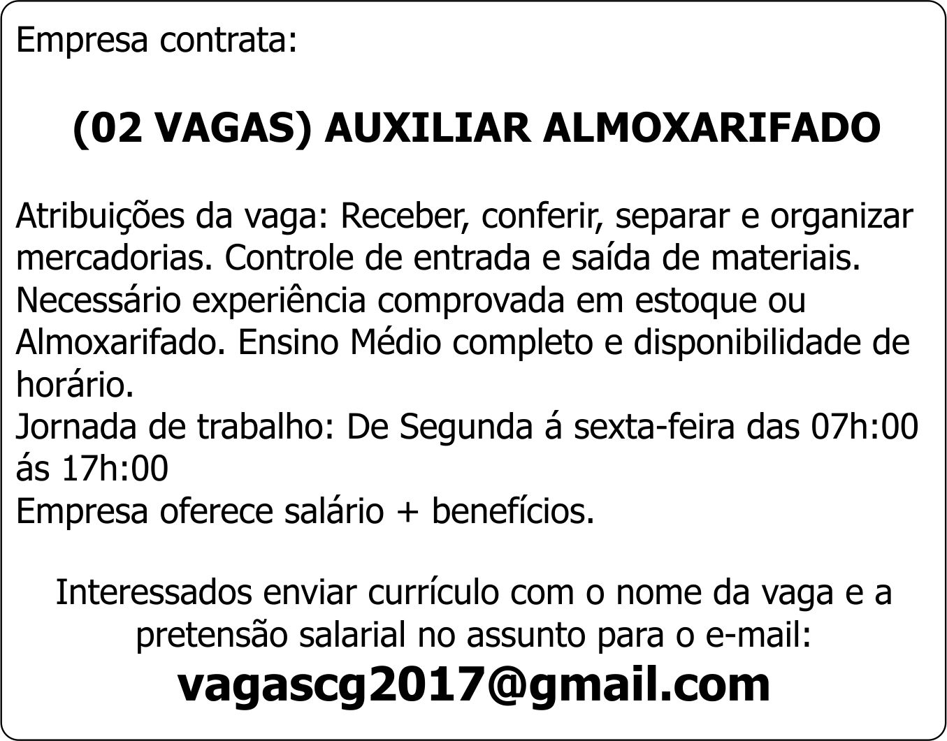 Atribuições da vaga: Receber, conferir, separar e organizar mercadorias. Controle de entrada e saída de materiais. Necessário experiência comprovada em estoque ou Almoxarifado. Ensino Médio completo e disponibilidade de horário.