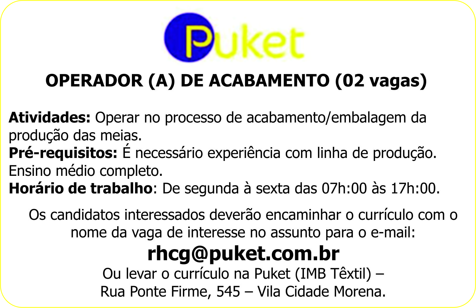 Ou levar o currículo na Puket (IMB Têxtil) – Rua Ponte Firme, 545 – Vila Cidade Morena.