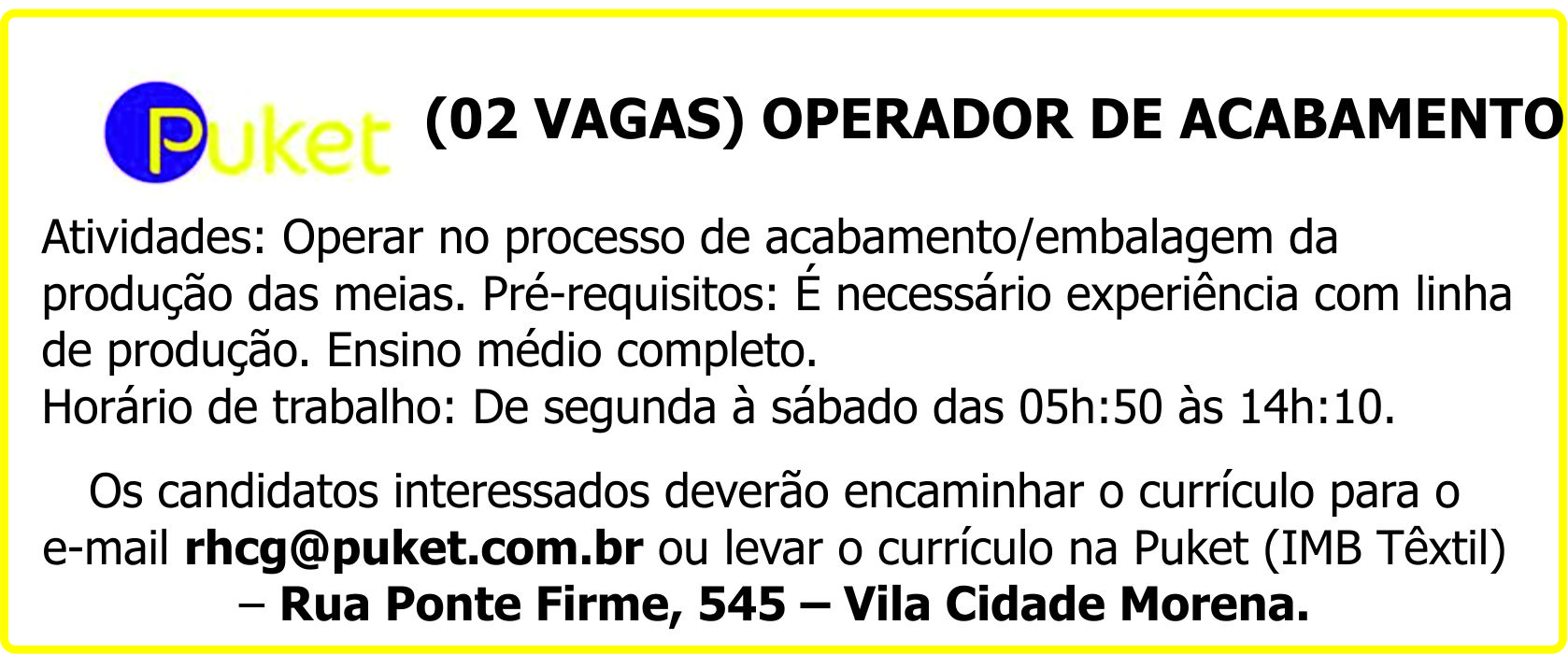 e-mail [email protected] ou levar o currículo na Puket (IMB Têxtil) – Rua Ponte Firme, 545 – Vila Cidade Morena.