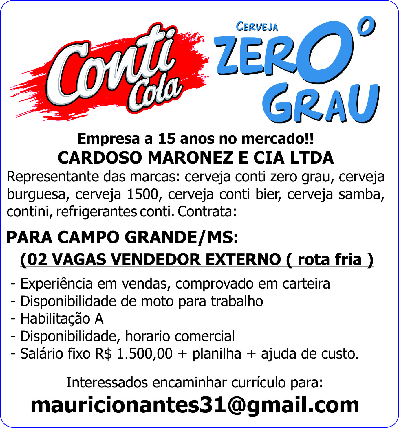 Representante das marcas: cerveja conti zero grau, cerveja burguesa, cerveja 1500, cerveja conti bier, cerveja samba, contini, refrigerantes conti. Contrata: