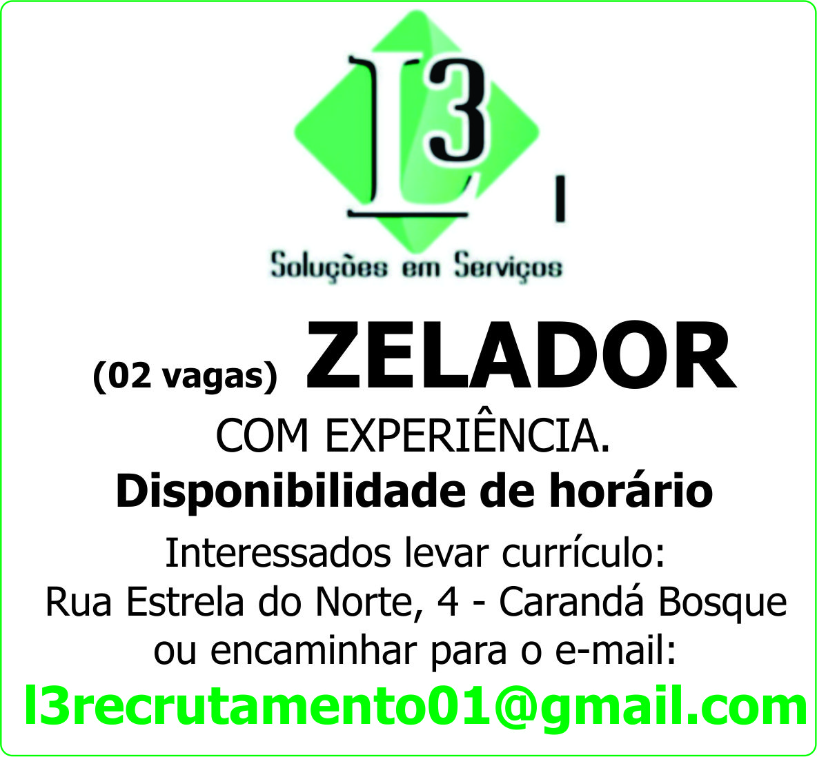 Interessados levar currículo: Rua Estrela do Norte, 4 - Carandá Bosque