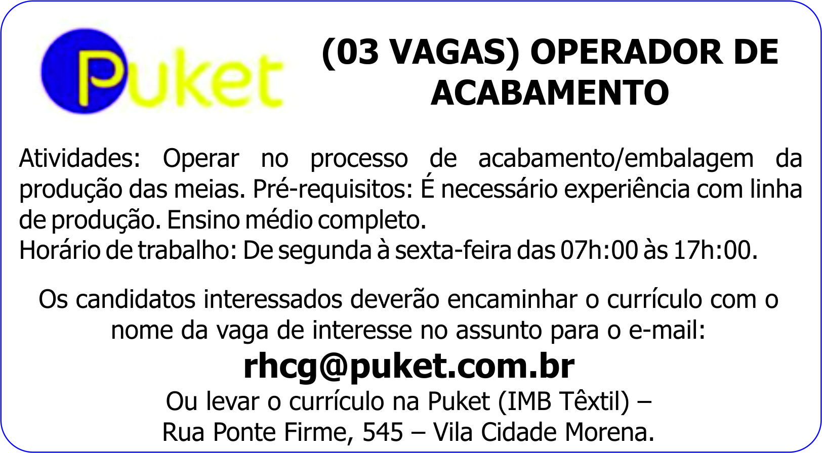 Ou levar o currículo na Puket (IMB Têxtil) – Rua Ponte Firme, 545 – Vila Cidade Morena.