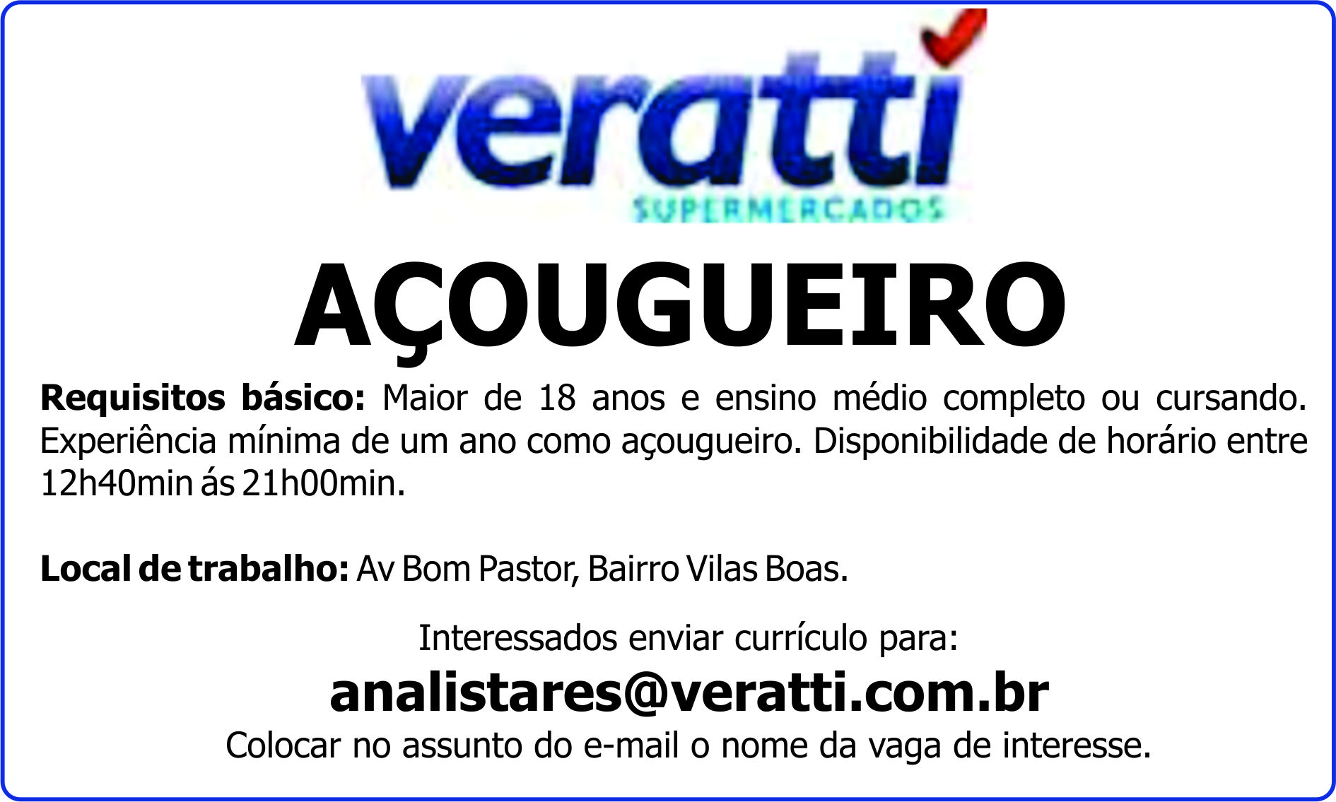 Requisitos básico: Maior de 18 anos e ensino médio completo ou cursando. Experiência mínima de um ano como açougueiro. Disponibilidade de horário entre 12h40min ás 21h00min.