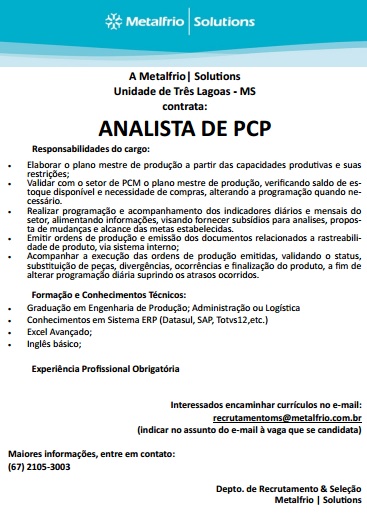 Analista de PCP - Três Lagoas