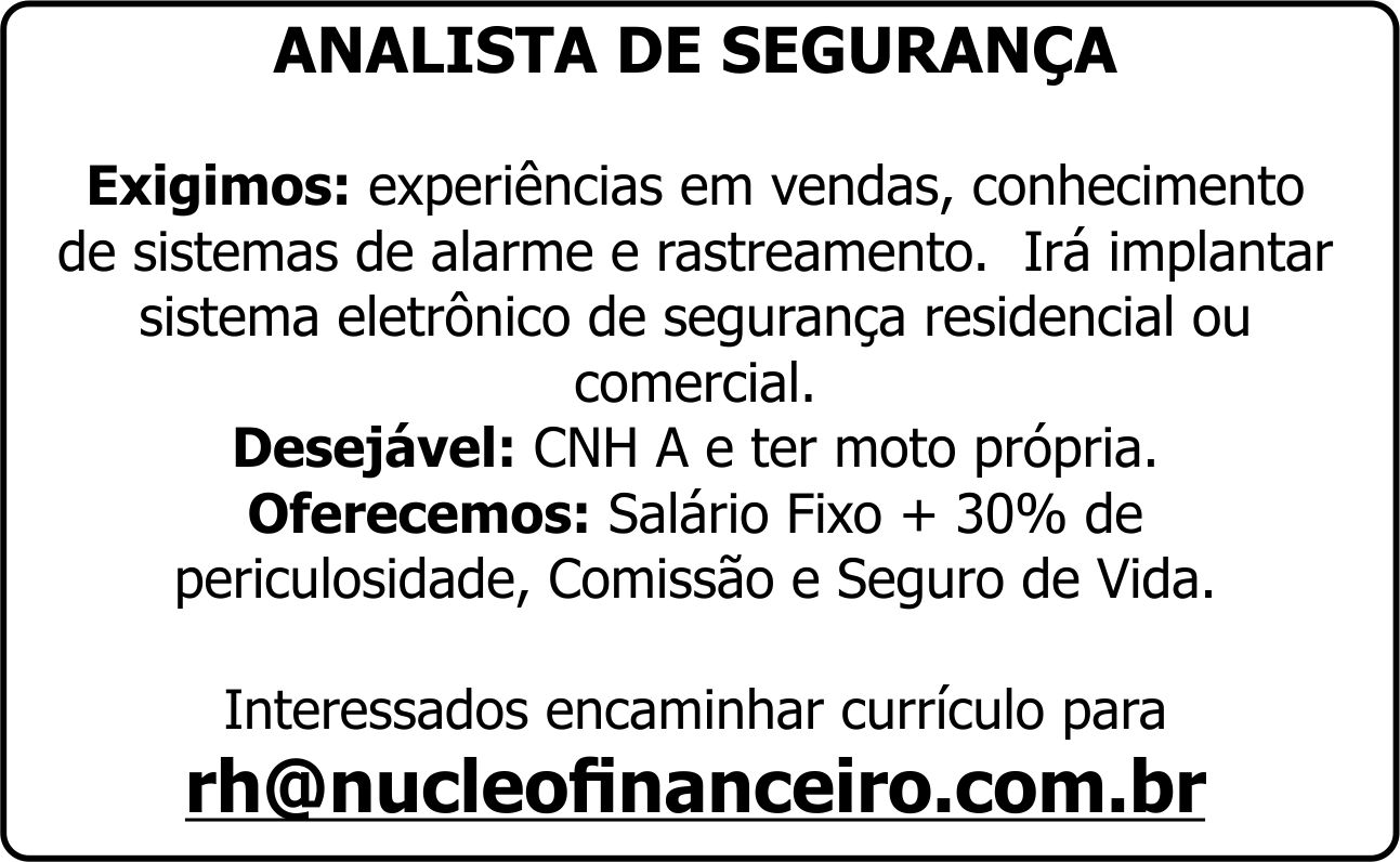 Exigimos: experiências em vendas, conhecimento de sistemas de alarme e rastreamento. Irá implantar sistema eletrônico de segurança residencial ou comercial.