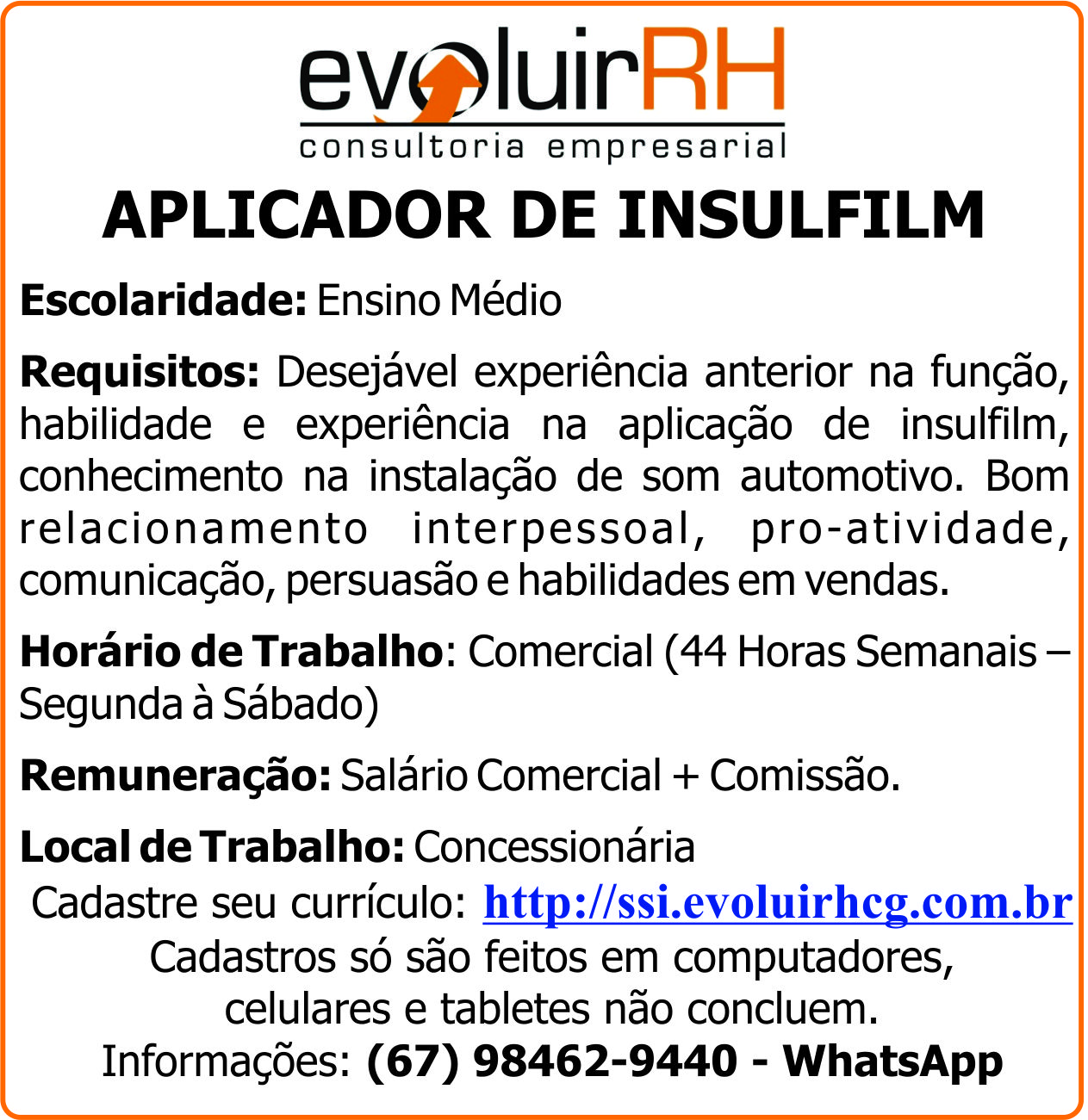 Requisitos: Desejável experiência anterior na função, habilidade e experiência na aplicação de insulfilm, conhecimento na instalação de som automotivo. Bom relacionamento interpessoal, pro-atividade, comunicação, persuasão e habilidades em vendas.