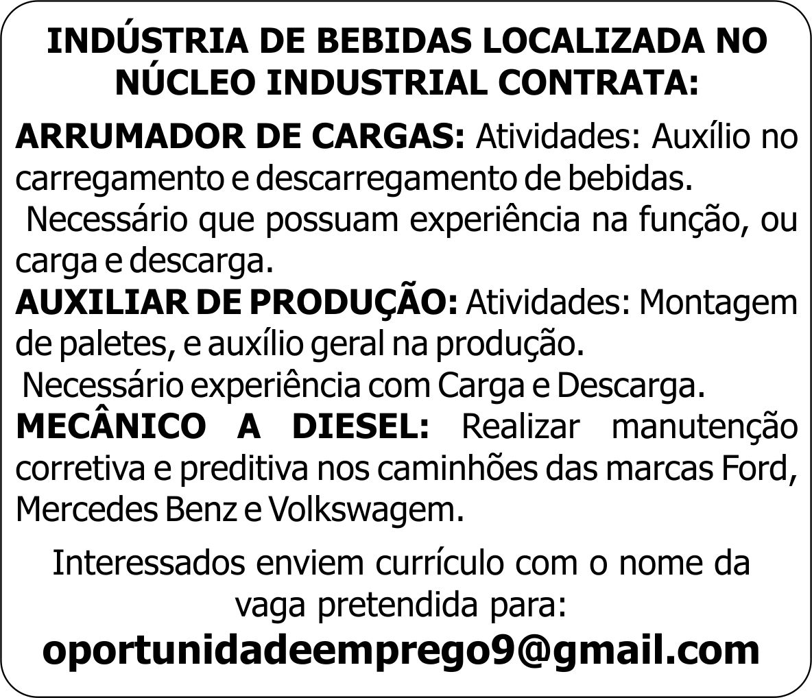 MECÂNICO A DIESEL: Realizar manutenção corretiva e preditiva nos caminhões das marcas Ford, Mercedes Benz e Volkswagem. Enviar currículo:
