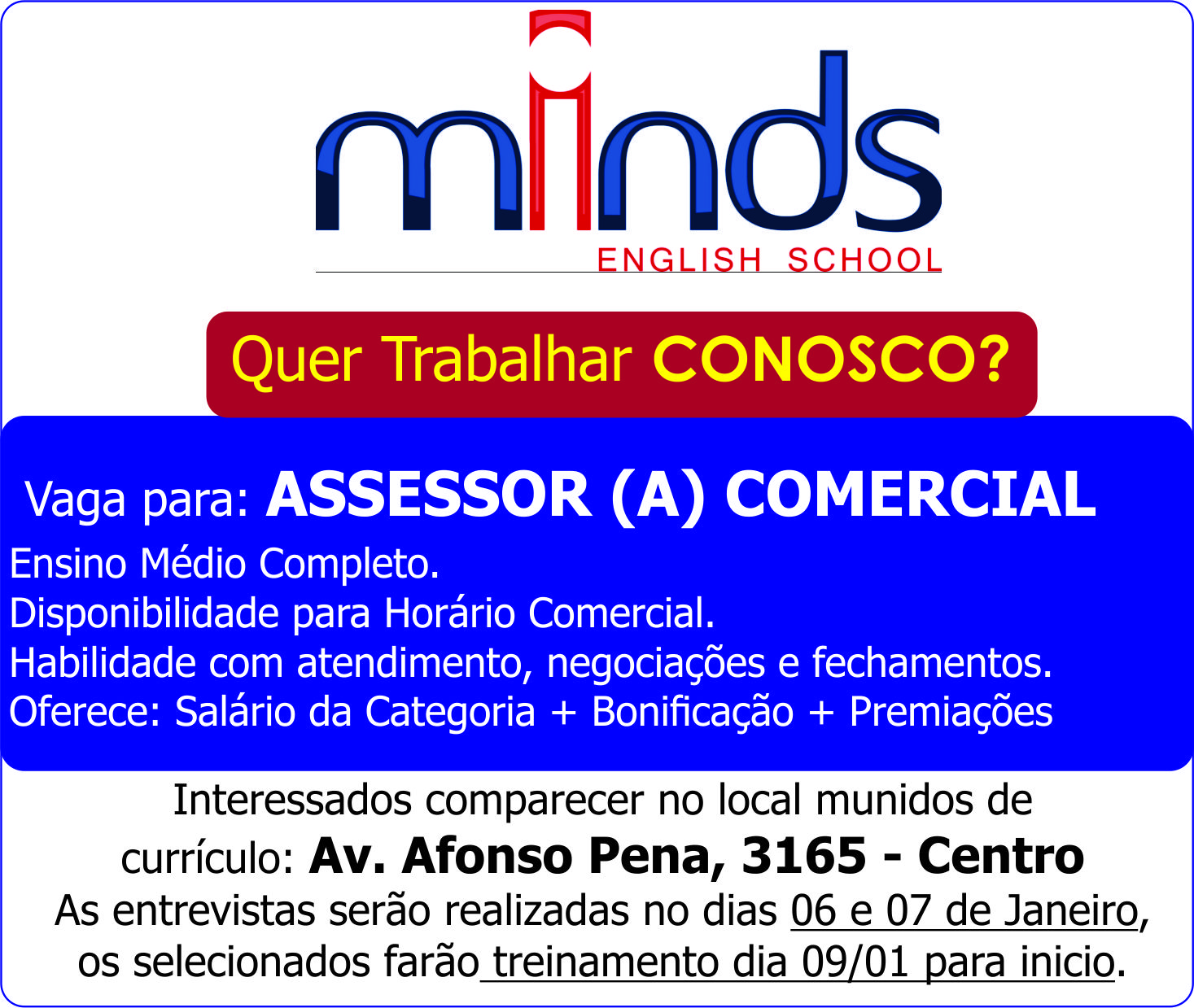 As entrevistas serão realizadas no dias 06 e 07 de Janeiro, os selecionados farão treinamento dia 09/01 para inicio.