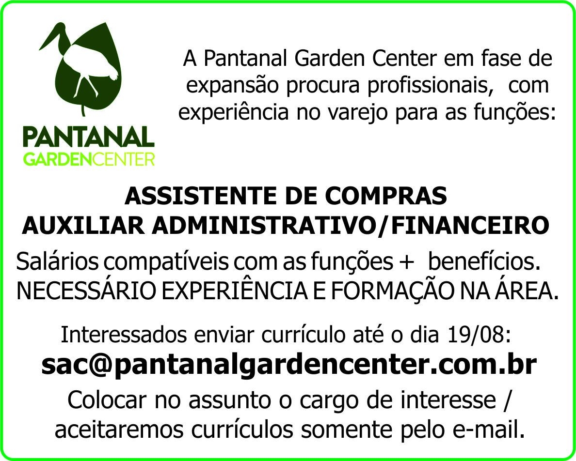 A Pantanal Garden Center em fase de expansão procura profissionais, com experiência no varejo para as funções: