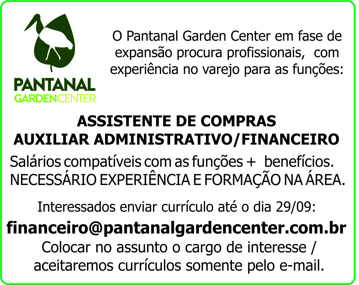 O Pantanal Garden Center em fase de expansão procura profissionais, com experiência no varejo para as funções: