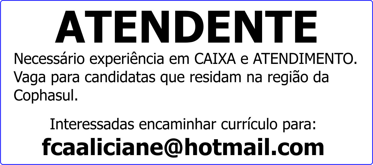 Necessário experiência em CAIXA e ATENDIMENTO.