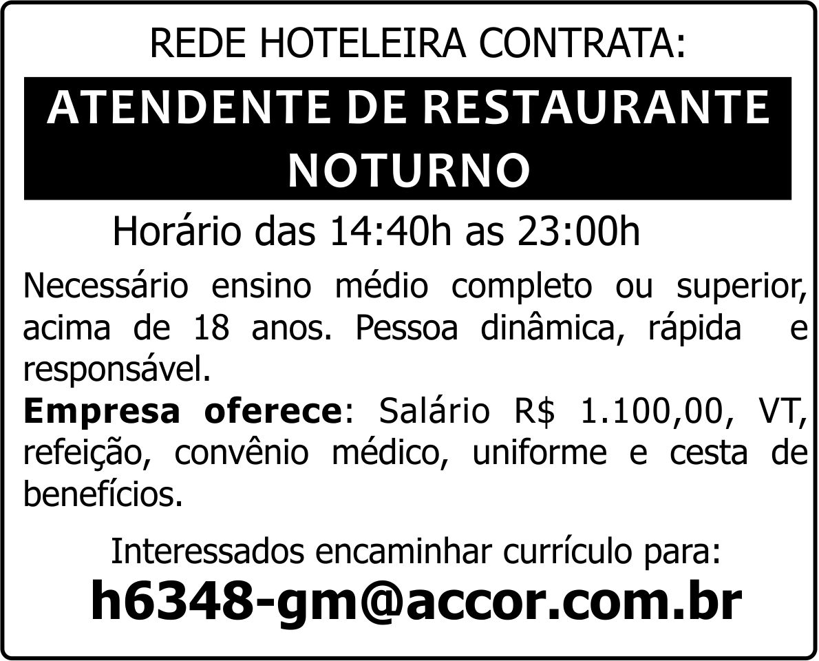 Horário das 14:40h as 23:00hNecessário ensino médio completo ou superior, acima de 18 anos. Pessoa dinâmica, rápida e responsável.