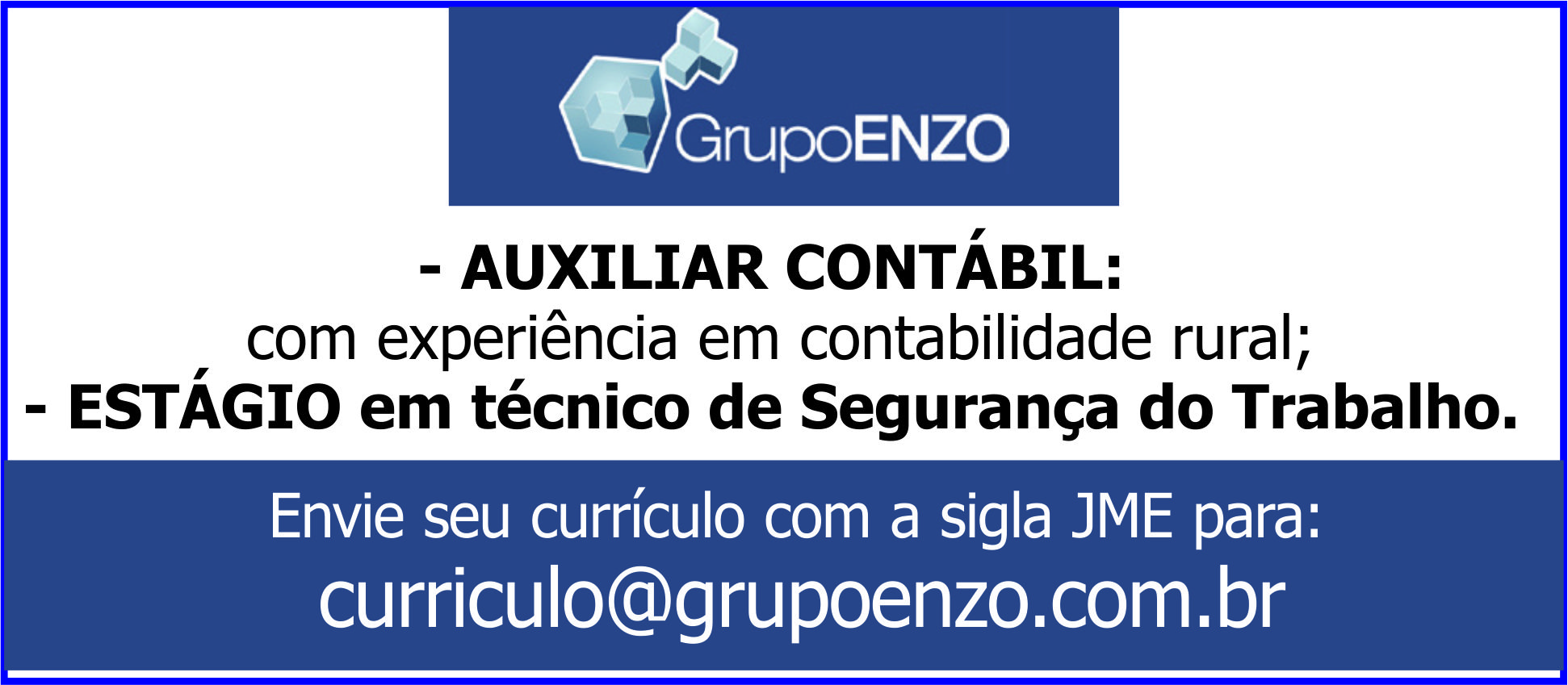 AUXILIAR CONTÁBIL: com experiência em contabilidade rural ESTÁGIO em técnico de Segurança do Trabalho. Envie seu currículo com a sigla JME para: [email protected]