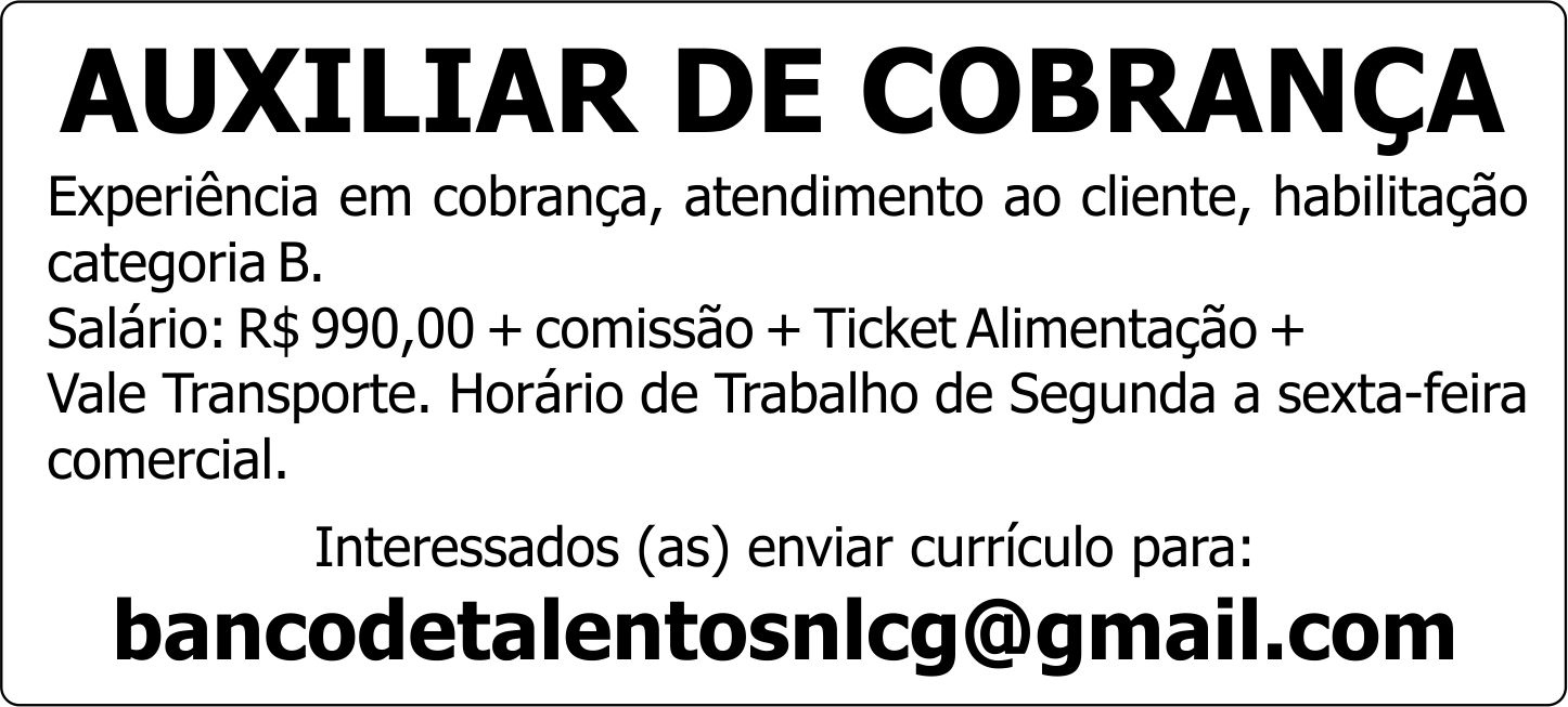 Experiência em cobrança, atendimento ao cliente, habilitação categoria B.