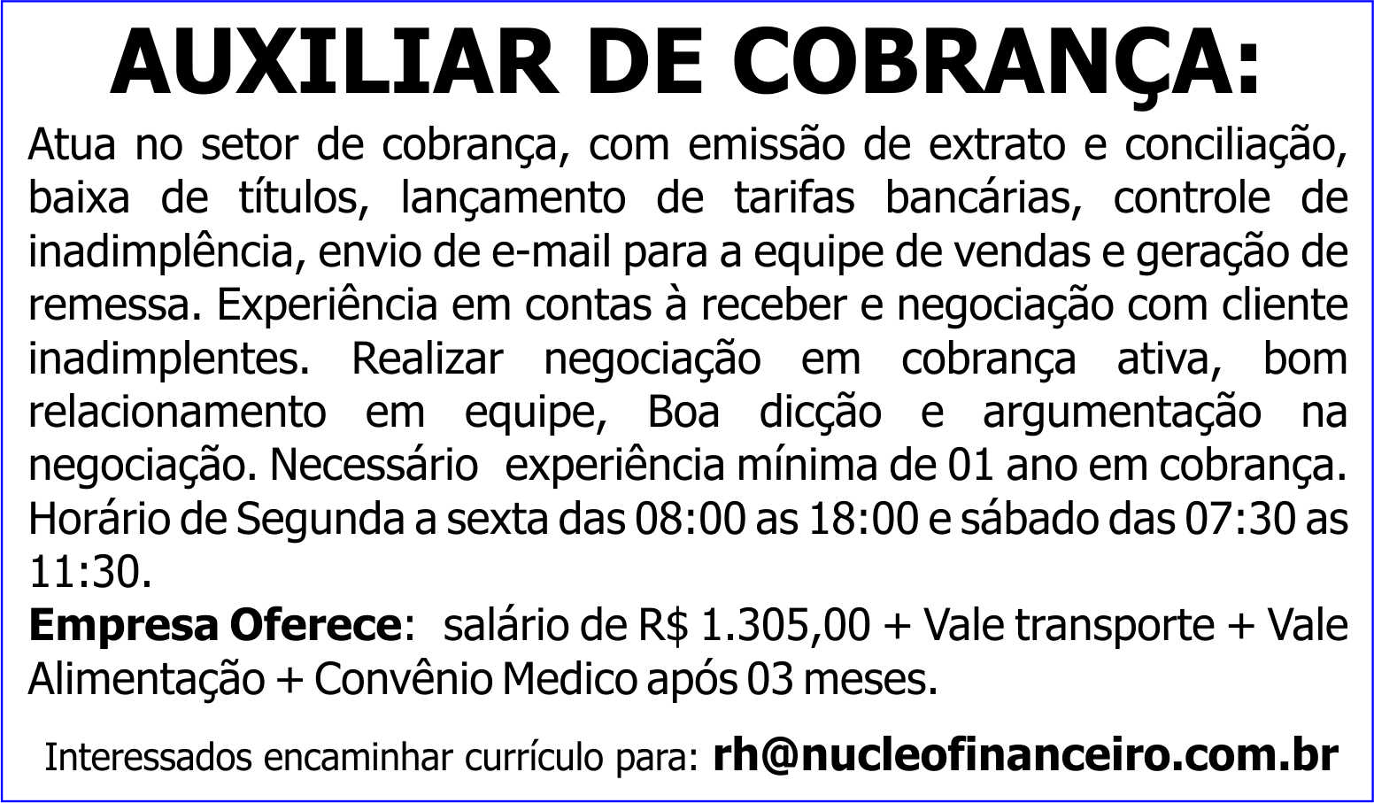 Necessário experiência mínima de 01 ano em cobrança.