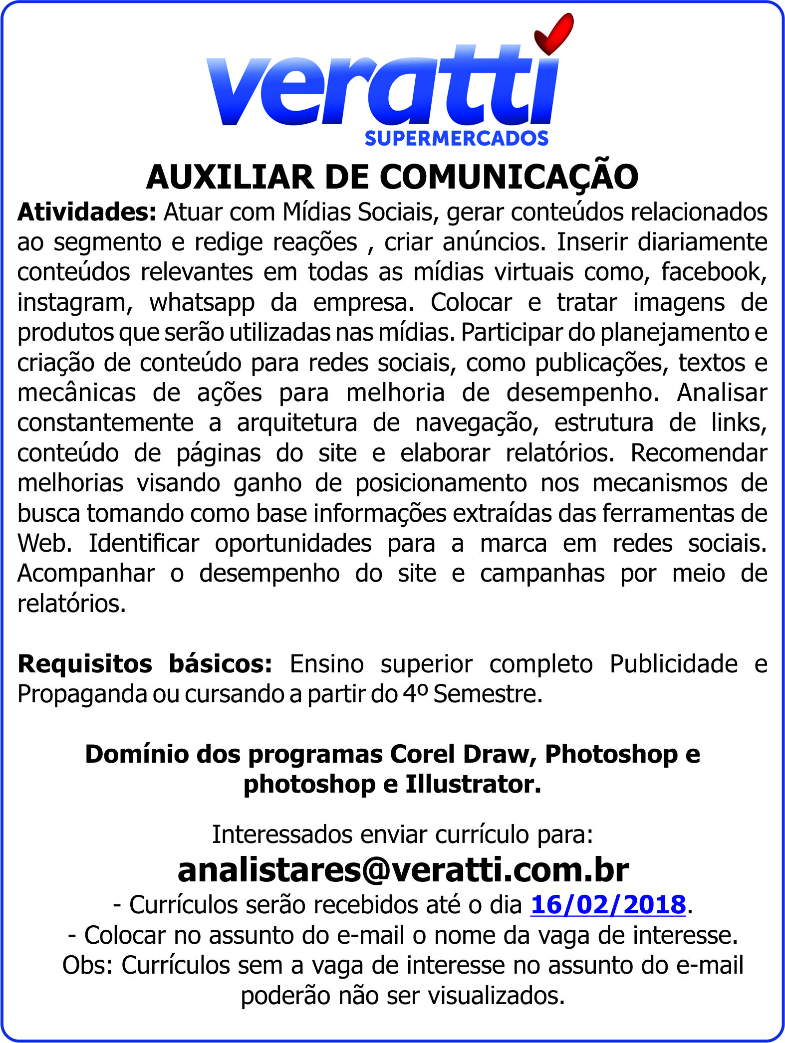 - Currículos serão recebidos até o dia 16/02/2018.