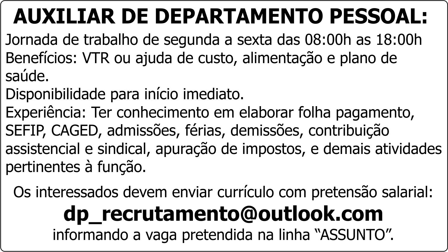 Experiência: Ter conhecimento em elaborar folha pagamento, SEFIP, CAGED, admissões, férias, demissões, contribuição assistencial e sindical, apuração de impostos, e demais atividades pertinentes à função. Enviar currículo: