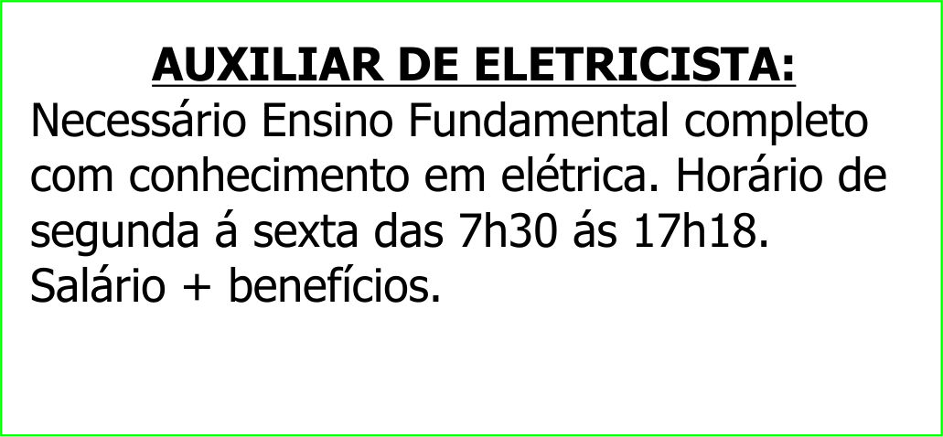 Necessário Ensino Fundamental completo com conhecimento em elétrica. Horário de segunda á sexta das 7h30 ás 17h18. Salário + benefícios.