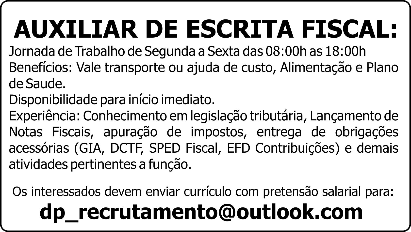 Experiência: Conhecimento em legislação tributária, Lançamento de Notas Fiscais, apuração de impostos, entrega de obrigações acessórias (GIA, DCTF, SPED Fiscal, EFD Contribuições) e demais atividades pertinentes a função. Enviar currículo: