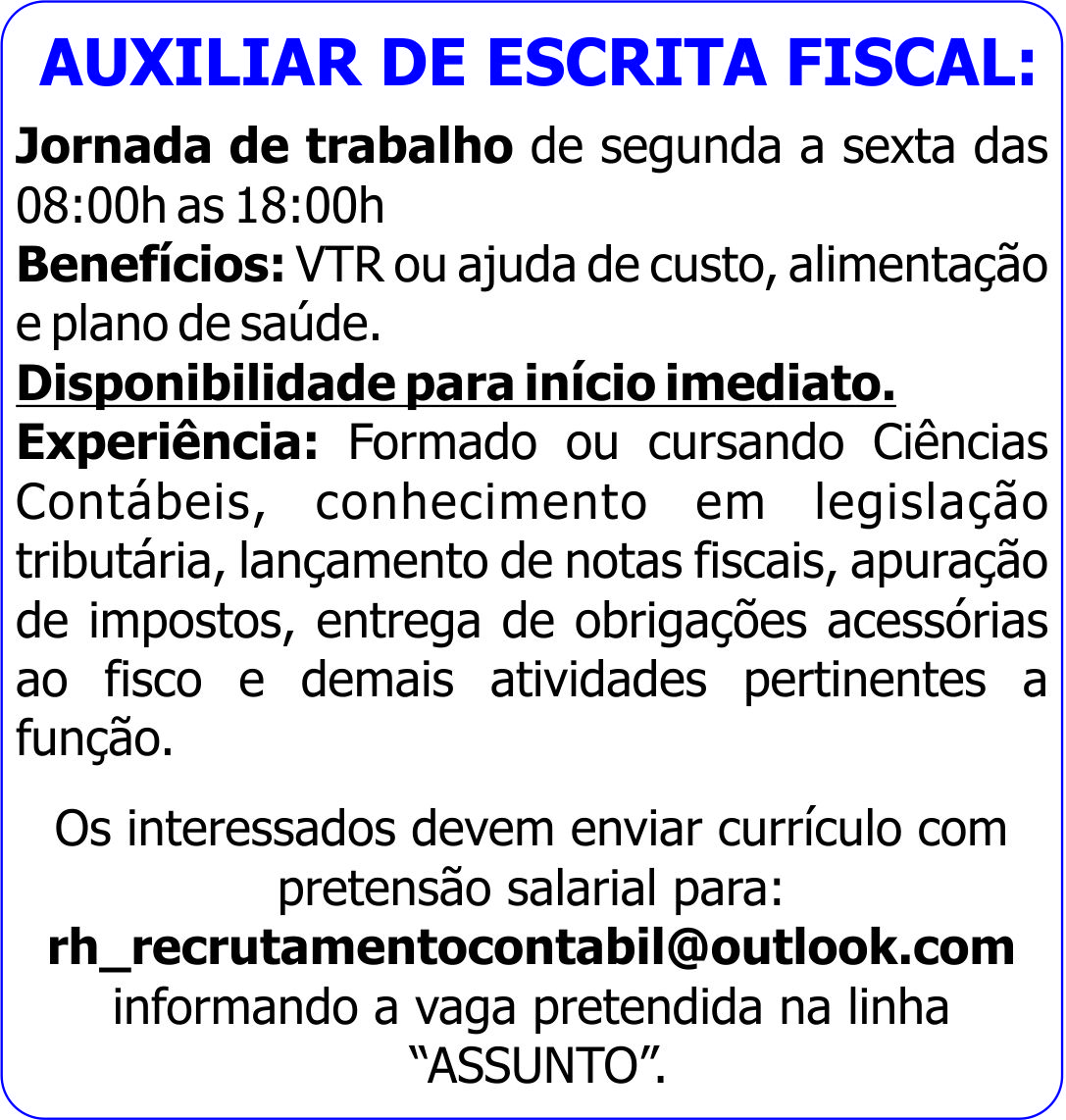 Experiência: Formado ou cursando Ciências Contábeis, conhecimento em legislação tributária, lançamento de notas fiscais, apuração de impostos, entrega de obrigações acessórias ao fisco e demais atividades pertinentes a função.