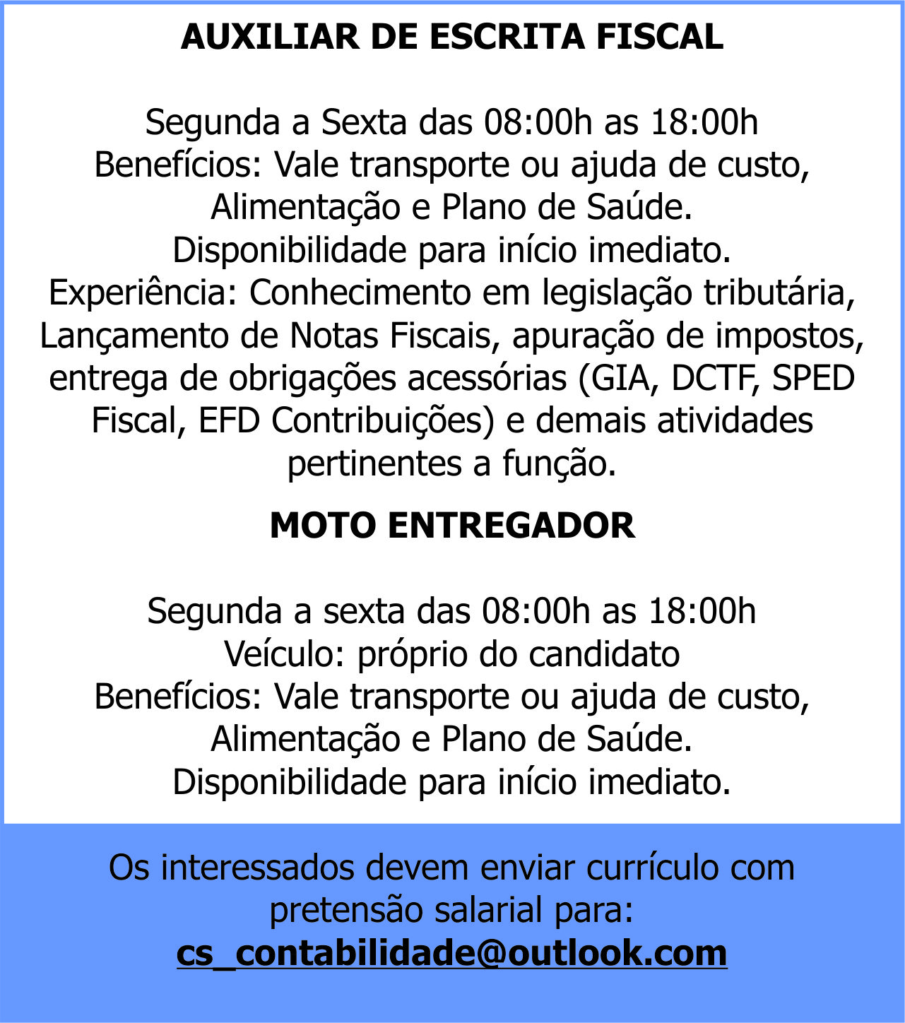 AUXILIAR DE ESCRITA FISCALSegunda a Sexta das 08:00h as 18:00h