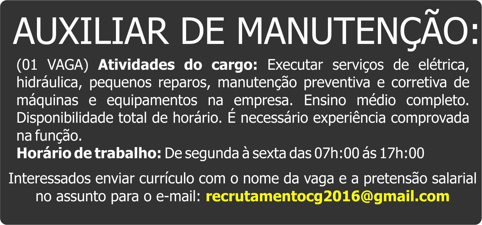 Horário de trabalho: De segunda à sexta das 07h:00 ás 17h:00 Enviar currículo: