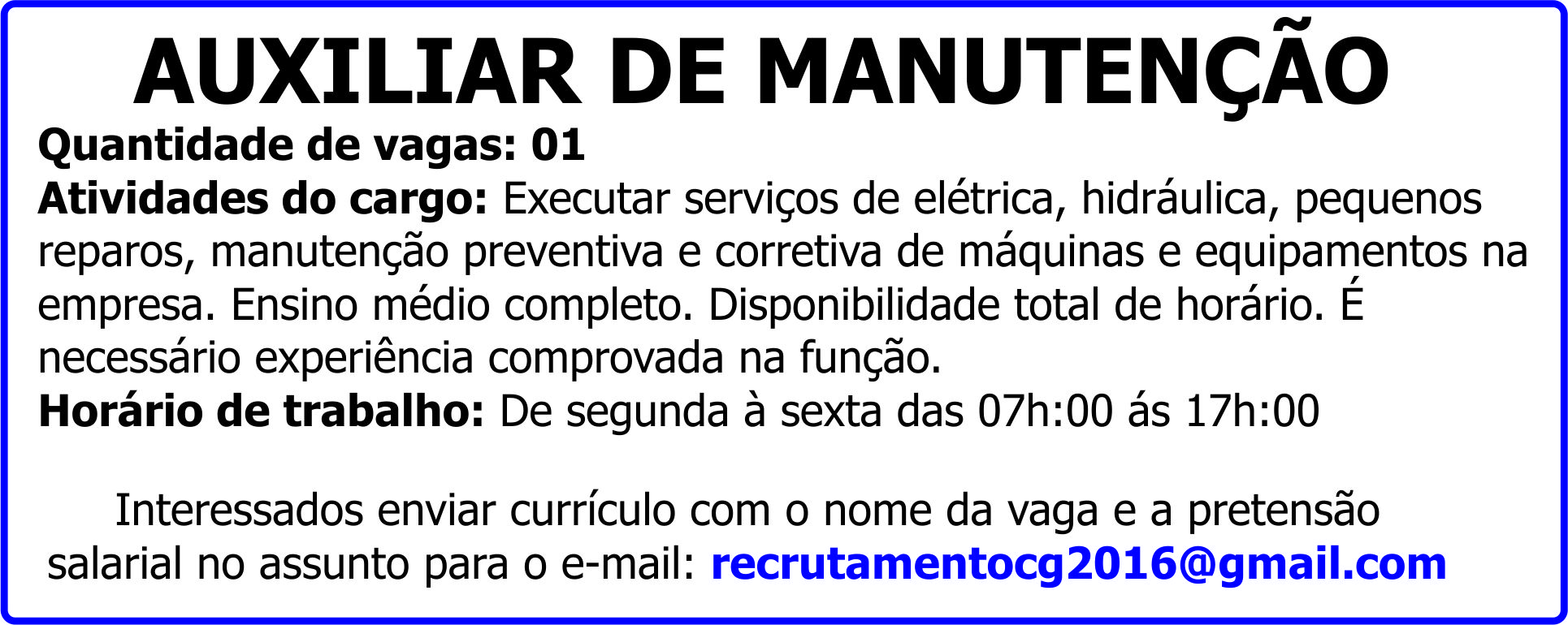 Atividades do cargo: Executar serviços de elétrica, hidráulica, pequenos reparos, manutenção preventiva e corretiva de máquinas e equipamentos na empresa. Ensino médio completo. Disponibilidade total de horário. É necessário experiência comprovada na função.