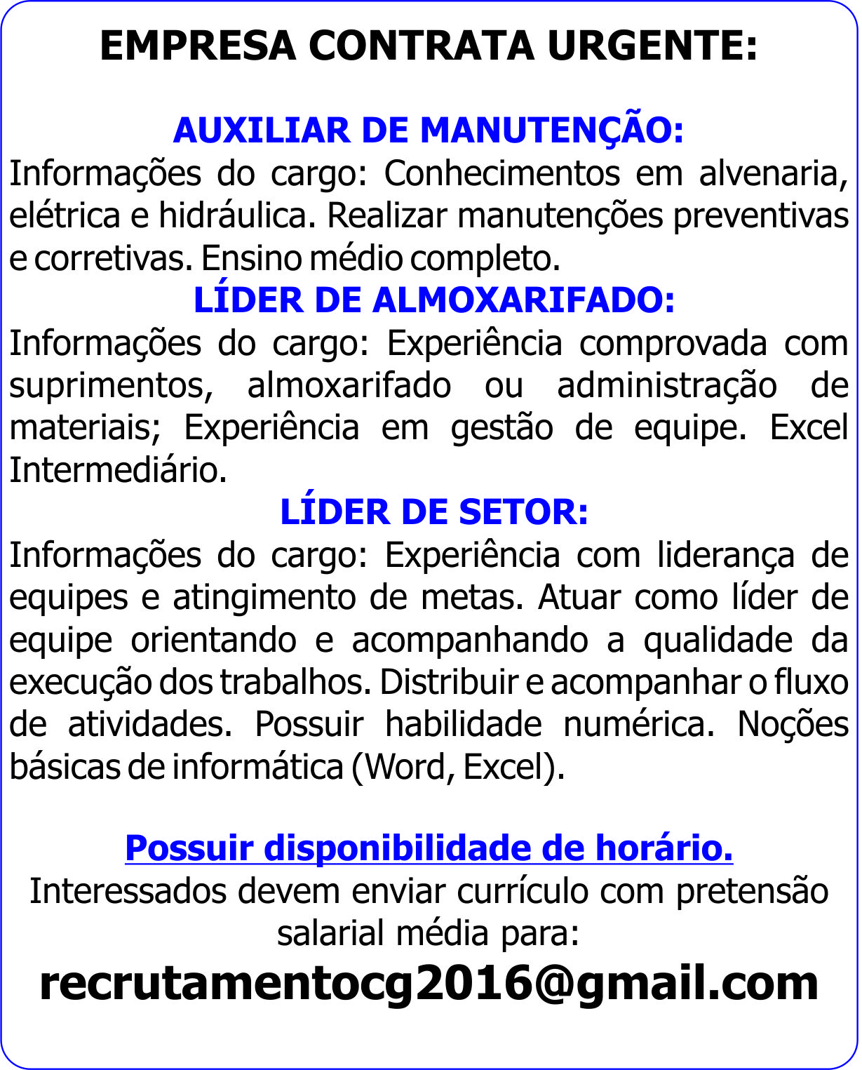 Auxiliar de Manutenção / Líder de Almoxarifado / Líder de Setor