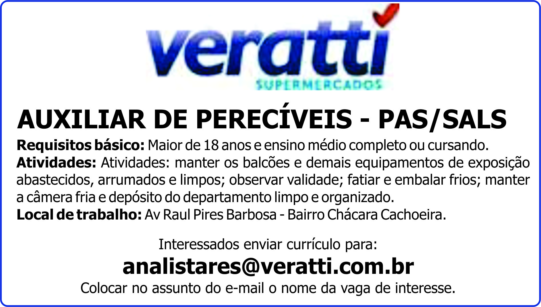 Atividades: Atividades: manter os balcões e demais equipamentos de exposição abastecidos, arrumados e limpos; observar validade; fatiar e embalar frios; manter a câmera fria e depósito do departamento limpo e organizado.