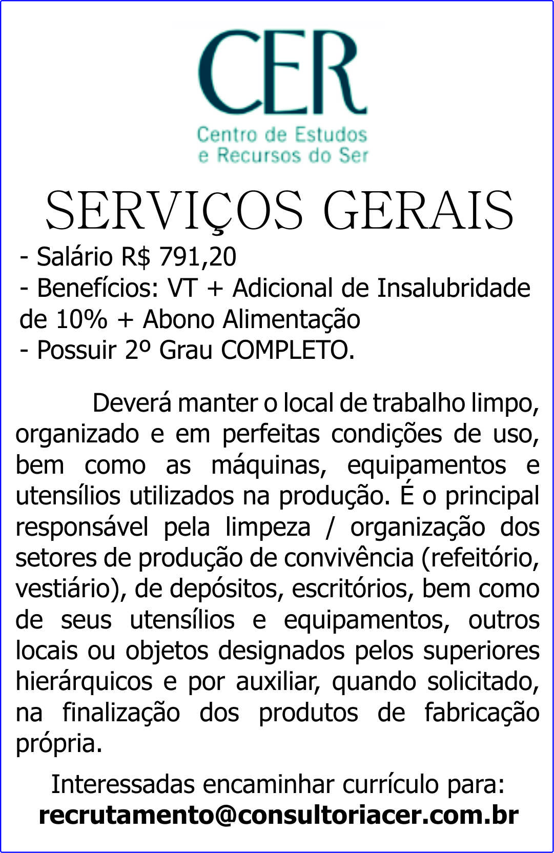 Deverá manter o local de trabalho limpo, organizado e em perfeitas condições de uso, bem como as máquinas, equipamentos e utensílios utilizados na produção. É o principal responsável pela limpeza / organização dos setores de produção de convivência (refeitório, vestiário), de depósitos, escritórios, bem como de seus utensílios e equipamentos, outros locais ou objetos designados pelos superiores hierárquicos e por auxiliar, quando solicitado, na finalização dos produtos de fabricação própria. Enviar currículo: