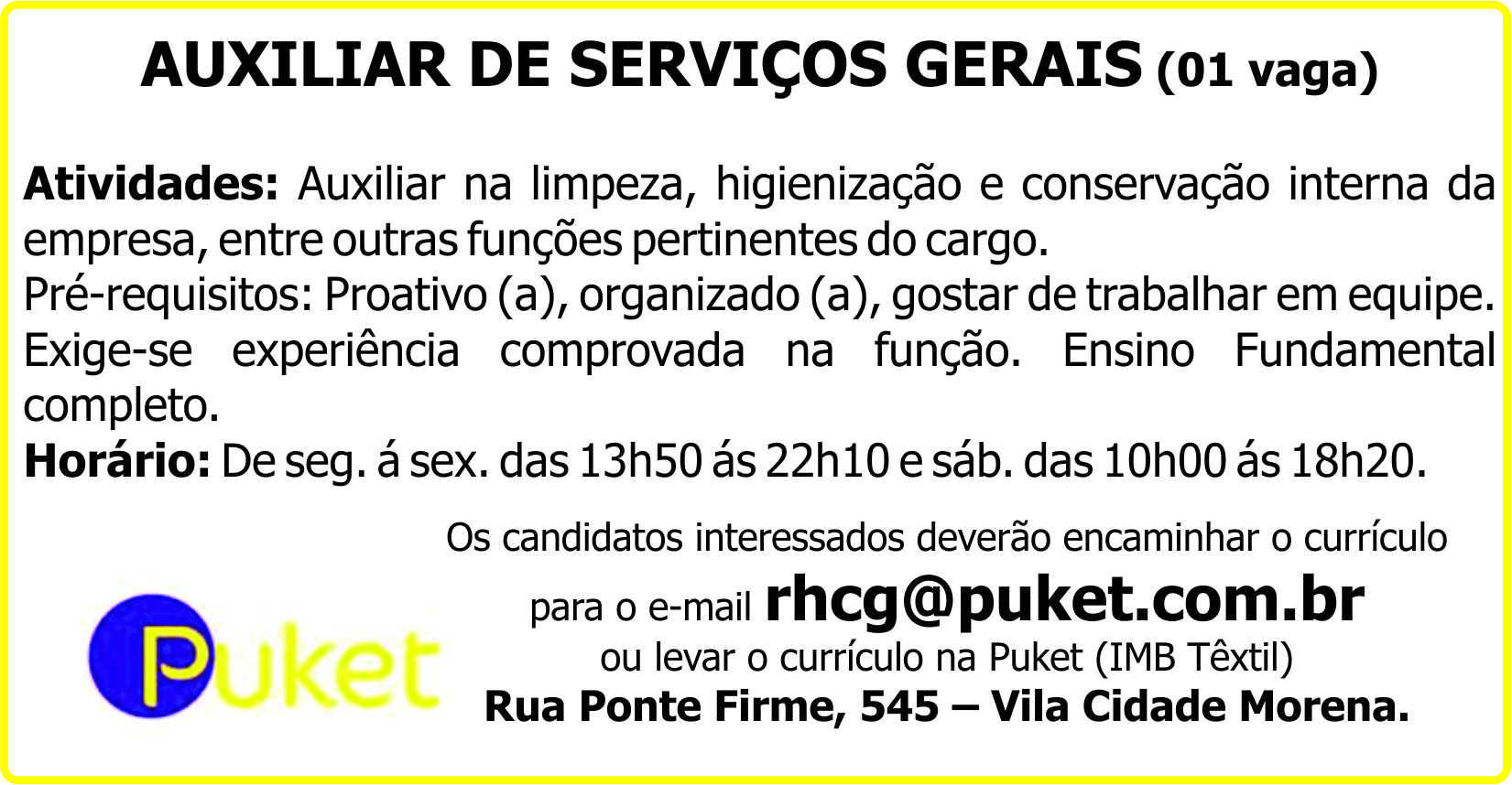 Os candidatos interessados deverão encaminhar o currículo para o e-mail [email protected] ou levar o currículo na Puket (IMB Têxtil) Rua Ponte Firme, 545 – Vila Cidade Morena.
