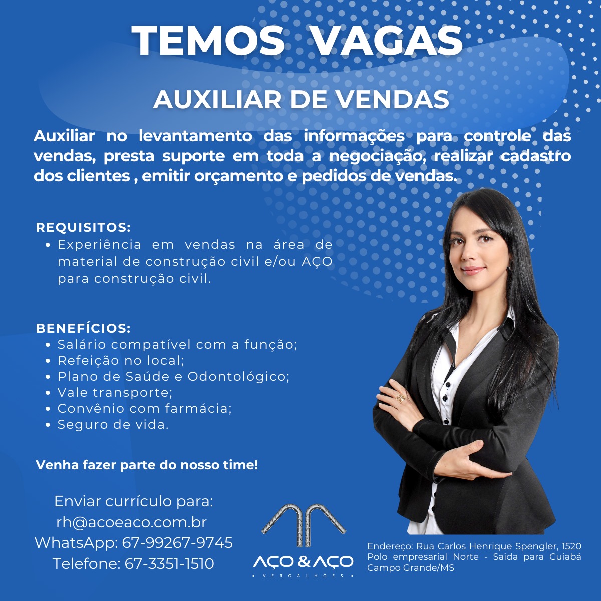Interessados enviar currículo para: [email protected] ou entregar pessoal da empresa AÇO E AÇO: Rua Carlos Henrique Spengler, 1520 - Polo Empresarial Norte. WhatsApp: (67) 99267-9745 ou 3351-1510
