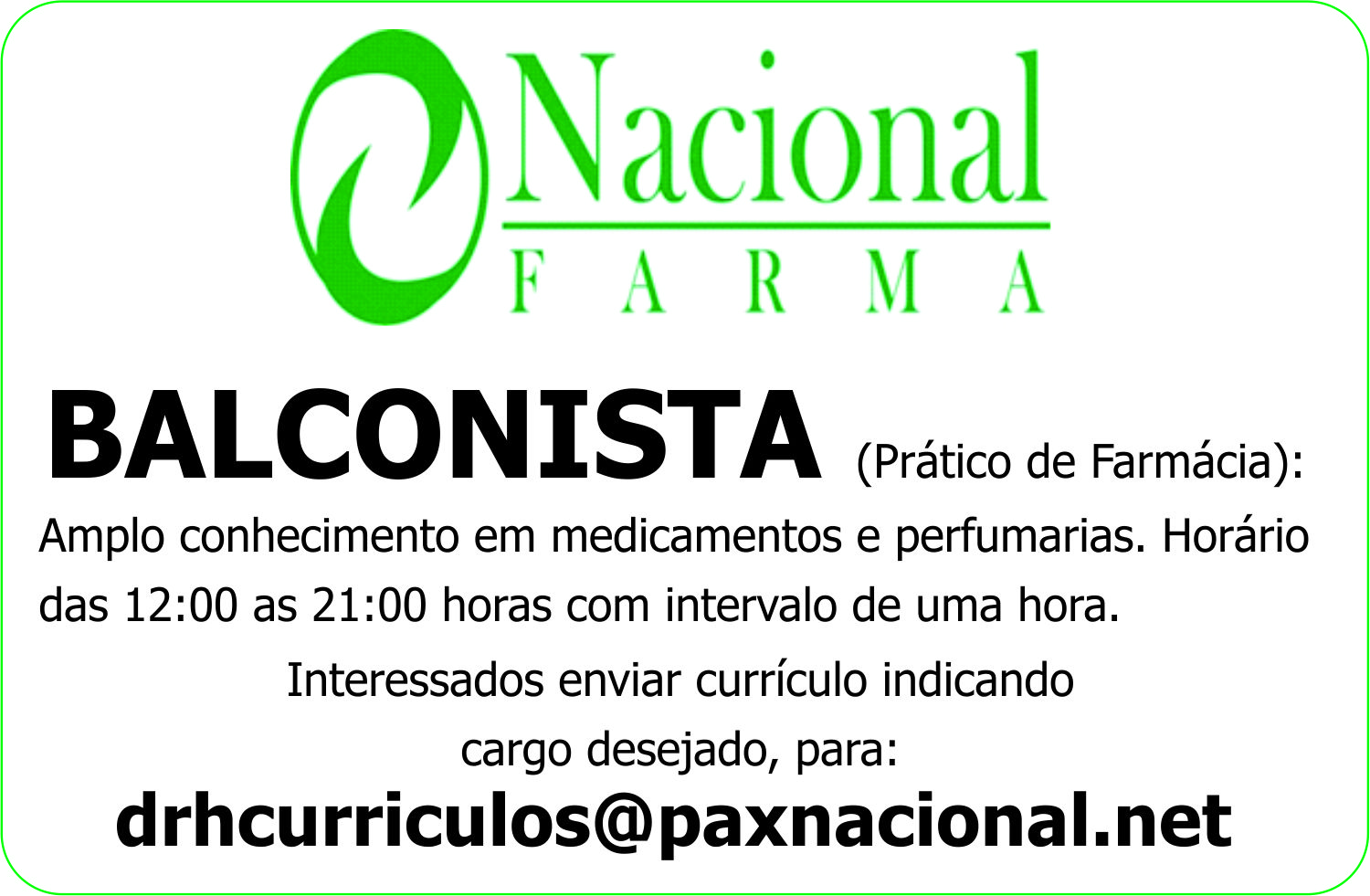 Amplo conhecimento em medicamentos e perfumarias. Horário das 12:00 as 21:00 horas com intervalo de uma hora.