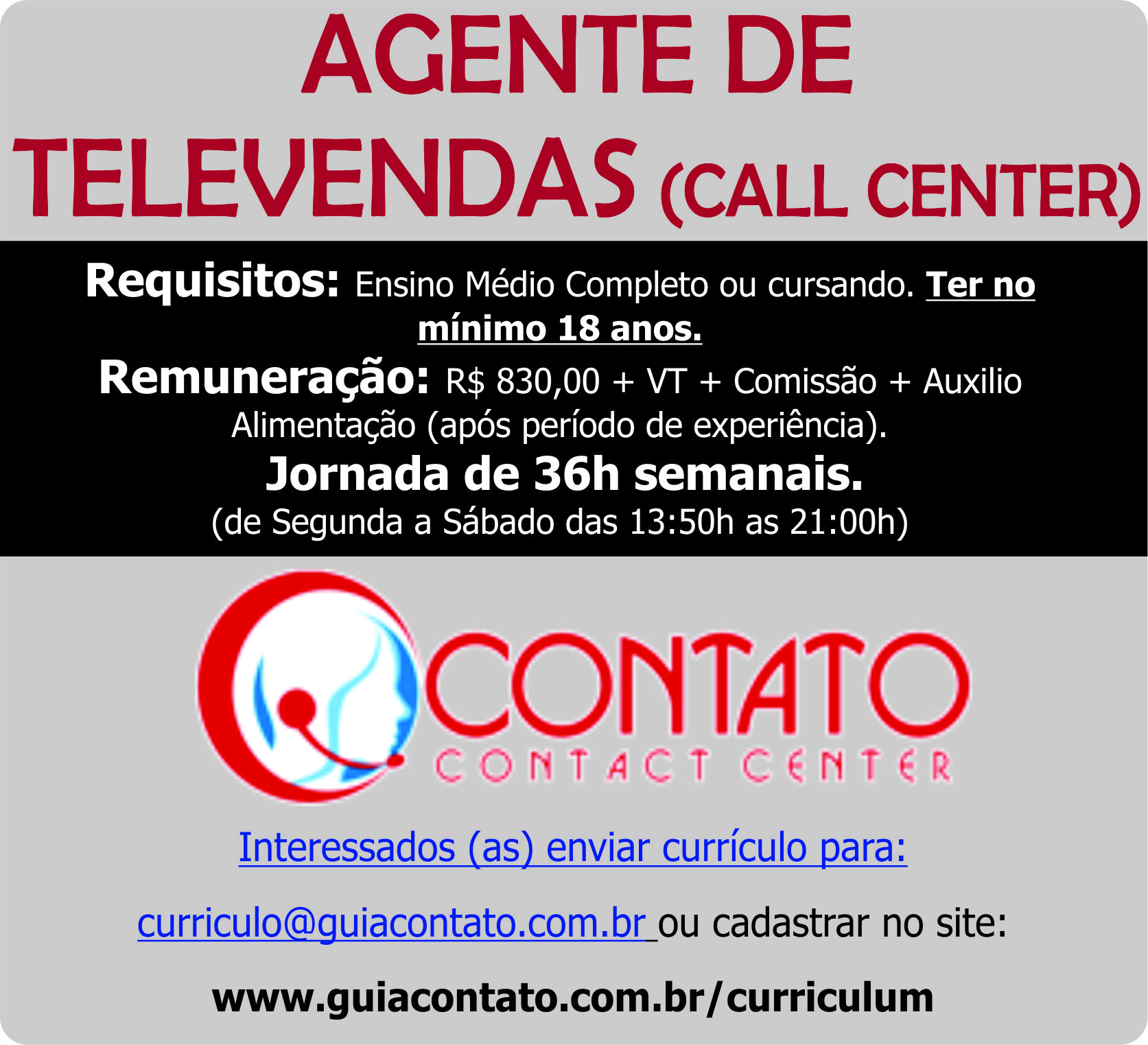 Interessados (as) enviar currículo para: [email protected] ou cadastrar no site: www.guiacontato.com.br/curriculum