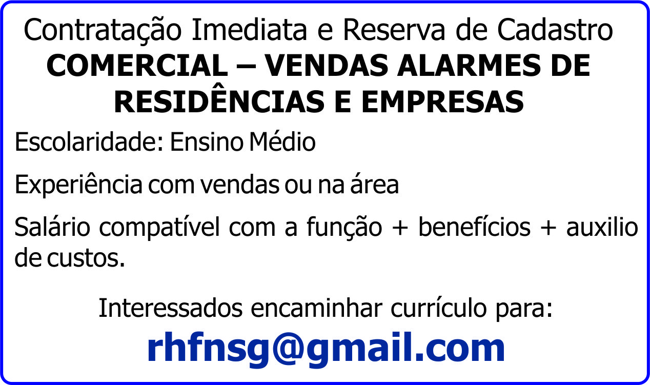 COMERCIAL – VENDAS ALARMES DE RESIDÊNCIAS E EMPRESAS;