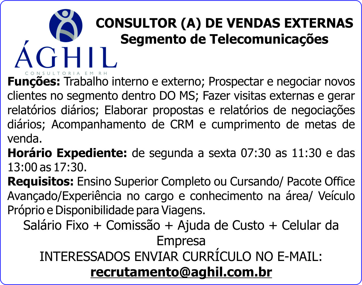Funções: Trabalho interno e externo; Prospectar e negociar novos clientes no segmento dentro DO MS; Fazer visitas externas e gerar relatórios diários; Elaborar propostas e relatórios de negociações diários; Acompanhamento de CRM e cumprimento de metas de venda.
