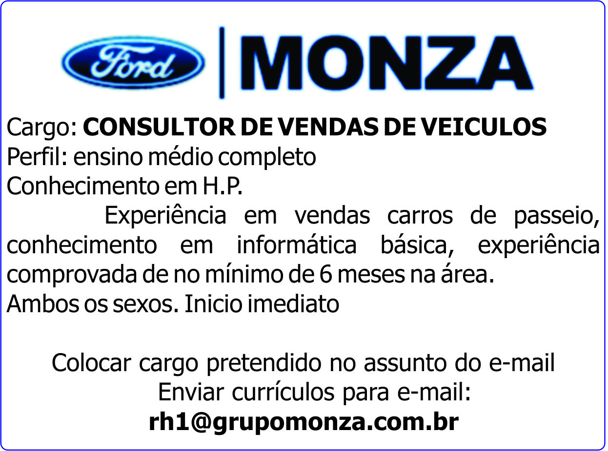 Experiência em vendas carros de passeio, conhecimento em informática básica, experiência comprovada de no mínimo de 6 meses na área.