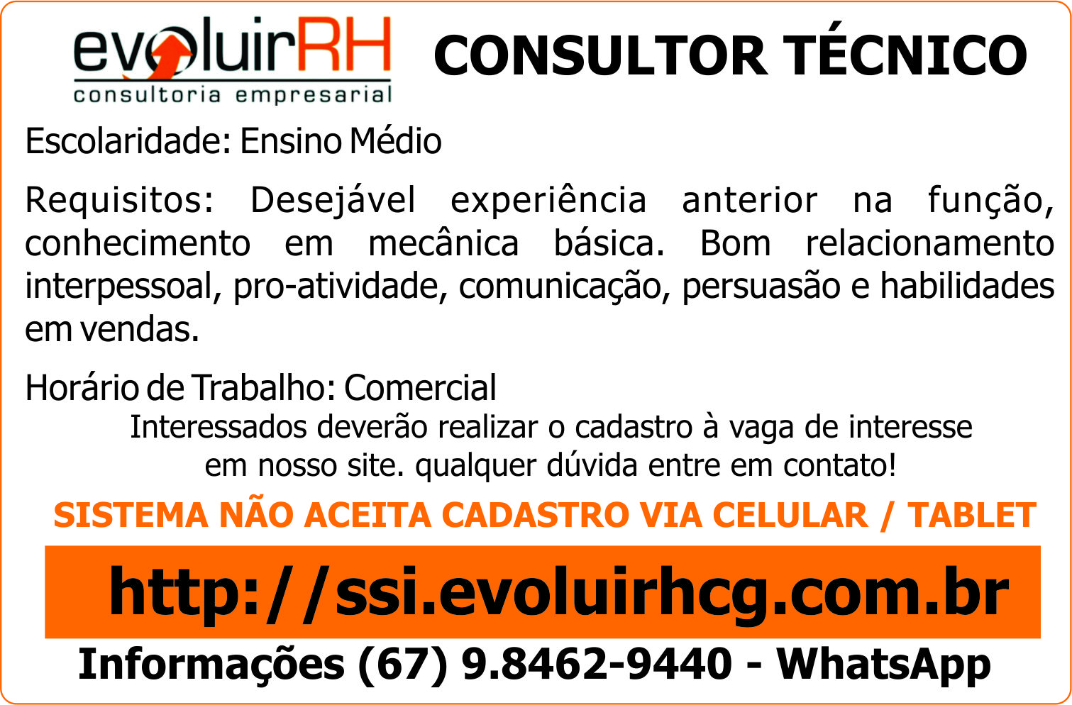 Requisitos: Desejável experiência anterior na função, conhecimento em mecânica básica. Bom relacionamento interpessoal, pro-atividade, comunicação, persuasão e habilidades em vendas.