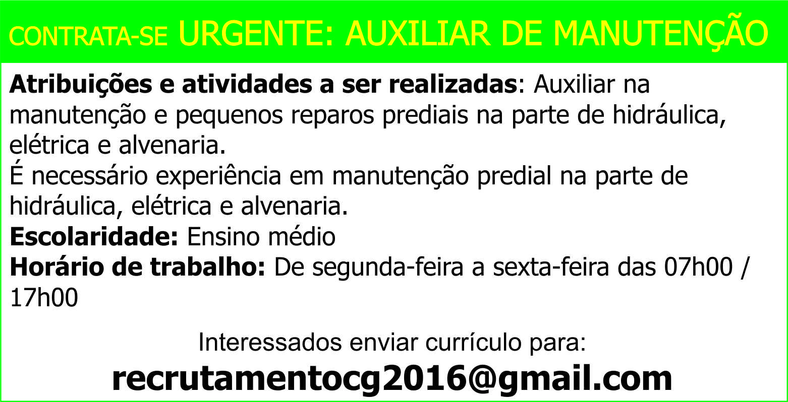 Contrata-se Urgente: Auxiliar de Manutenção