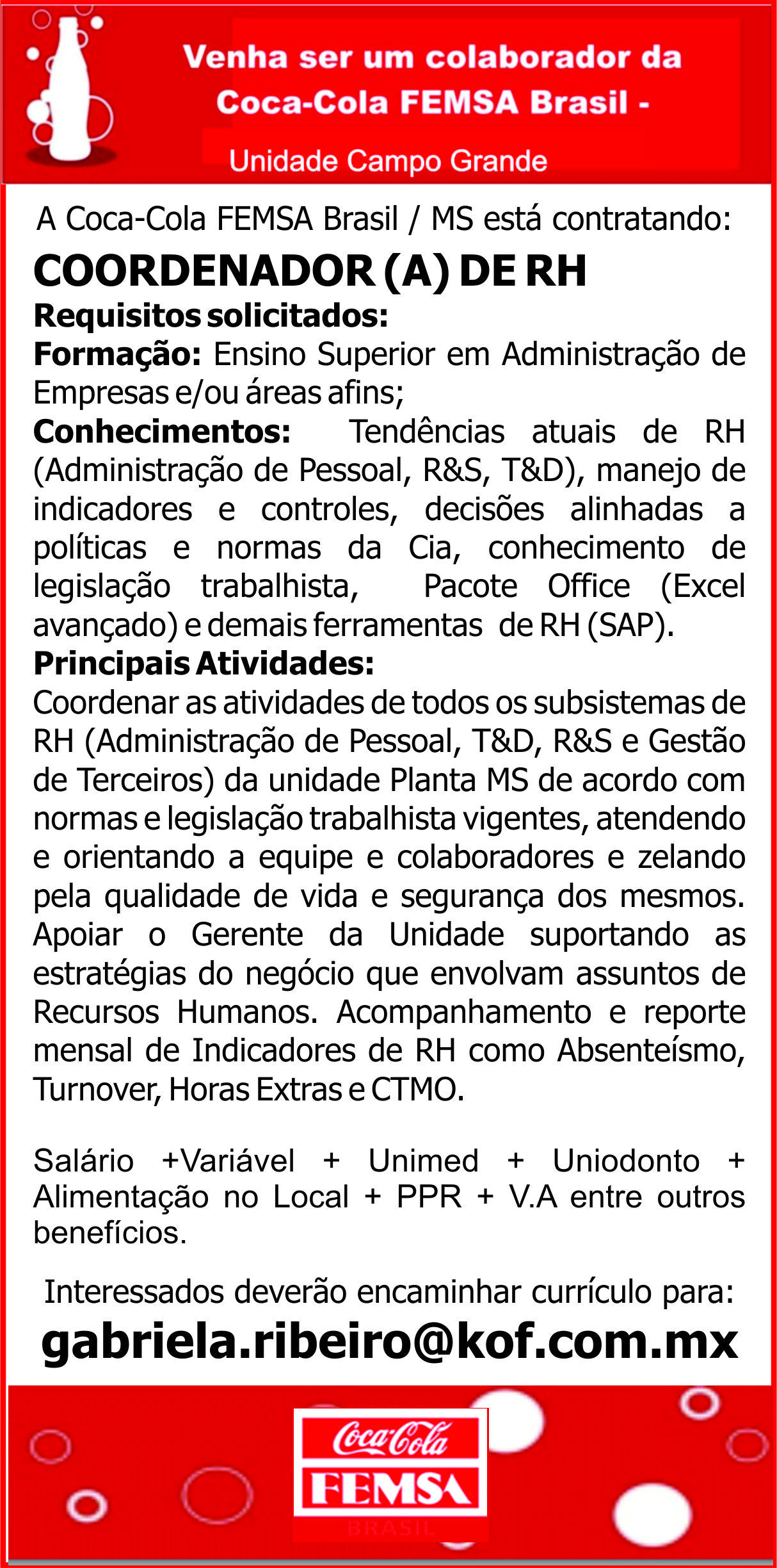 Principais Atividades: Coordenar as atividades de todos os subsistemas de RH (Administração de Pessoal, T&D, R&S e Gestão de Terceiros) da unidade Planta MS de acordo com normas e legislação trabalhista vigentes, atendendo e orientando a equipe e colaboradores e zelando pela qualidade de vida e segurança dos mesmos. Apoiar o Gerente da Unidade suportando as estratégias do negócio que envolvam assuntos de Recursos Humanos. Acompanhamento e reporte mensal de Indicadores de RH como Absenteísmo, Turnover, Horas Extras e CTMO.