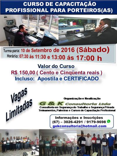 Curso de Capacitação Profissional para Porteiros (AS) Turmas: 10 de Setembro de 2016 Horário: 07:30 ás 11:30 e 13:00 às 17:00h Investimento: R$ 150,00 Informações e Inscrições: 3026-4291 / 99179-9698