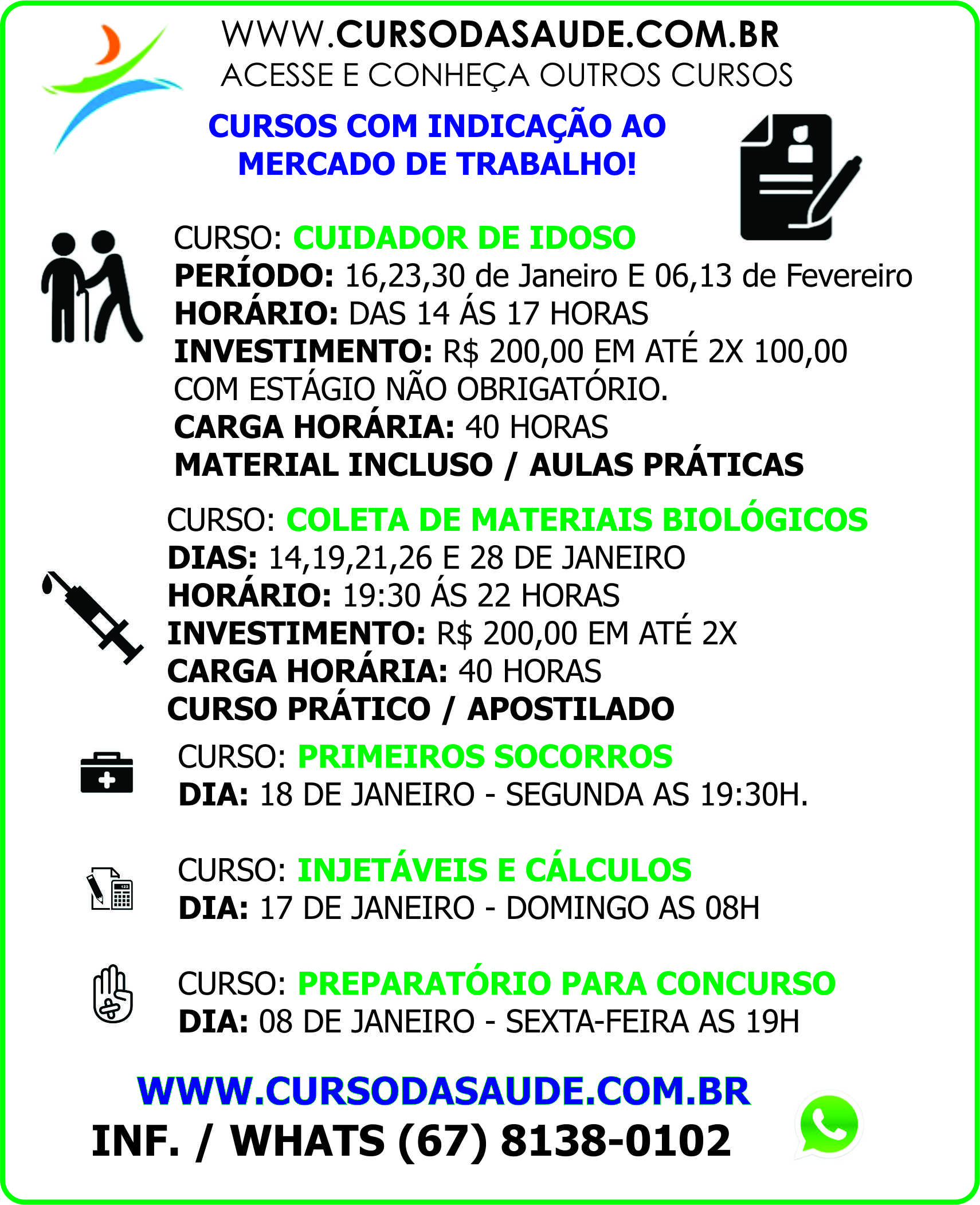 Curso da Área da Saúde - CUIDADOR DE IDOSO, COLETA DE MATERIAIS BIOLÓGICOS, INJETÁVEIS E CÁLCULO DE MEDICAMENTO,PRIMEIROS SOCORROS, PREPARATÓRIO PARA CONCURSO