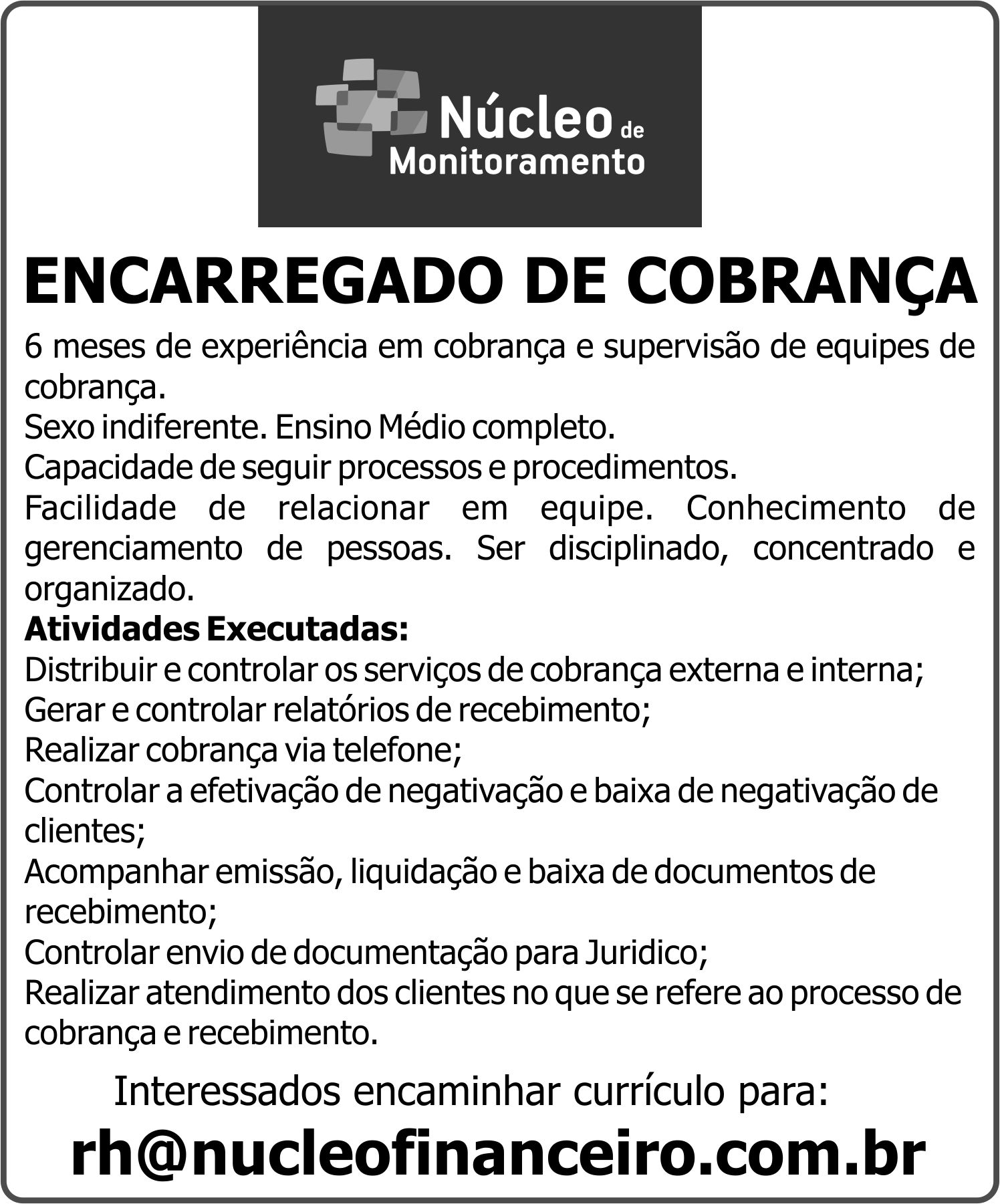 6 meses de experiência em cobrança e supervisão de equipes de cobrança.