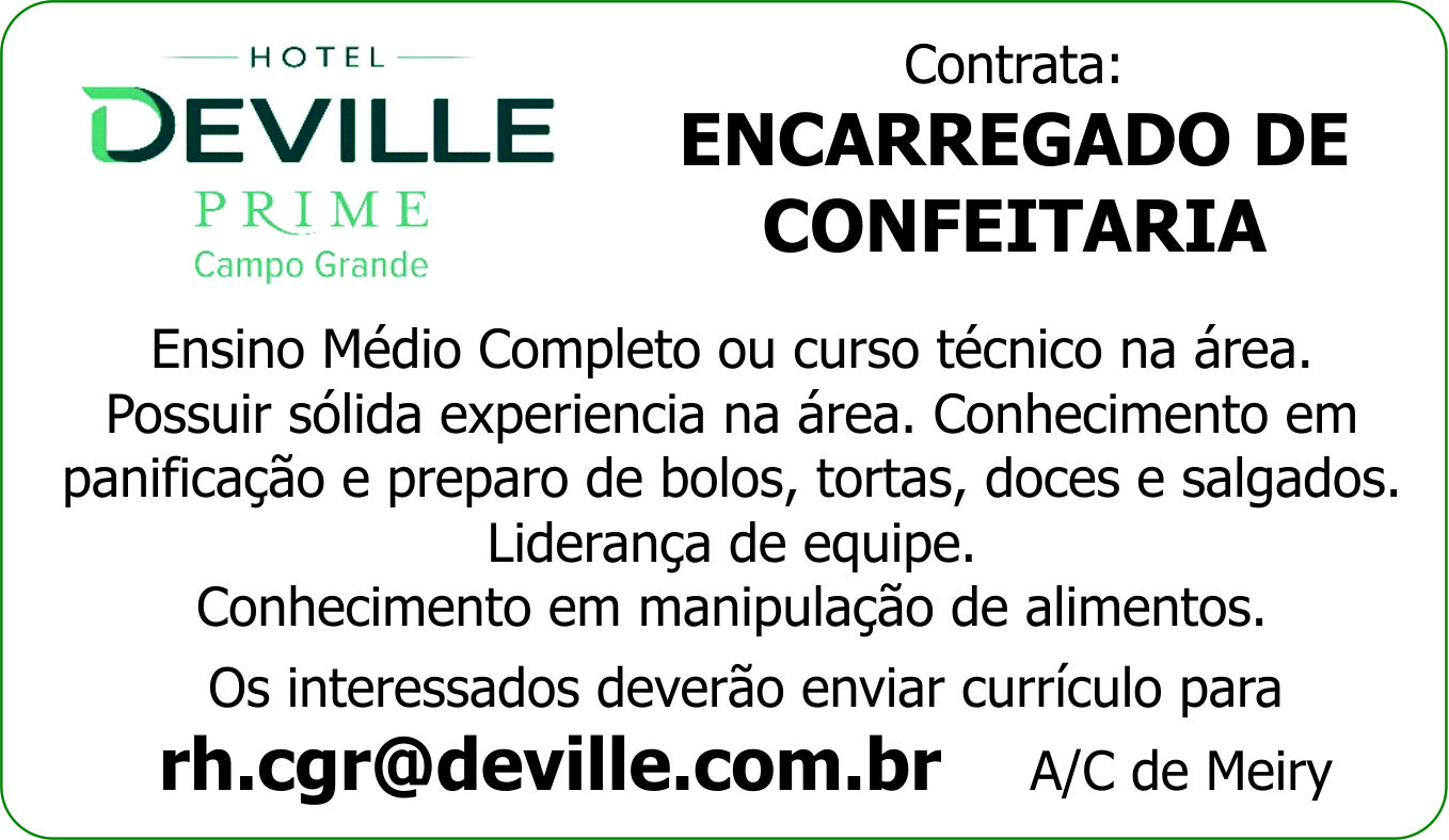 Possuir sólida experiencia na área. Conhecimento em panificação e preparo de bolos, tortas, doces e salgados.