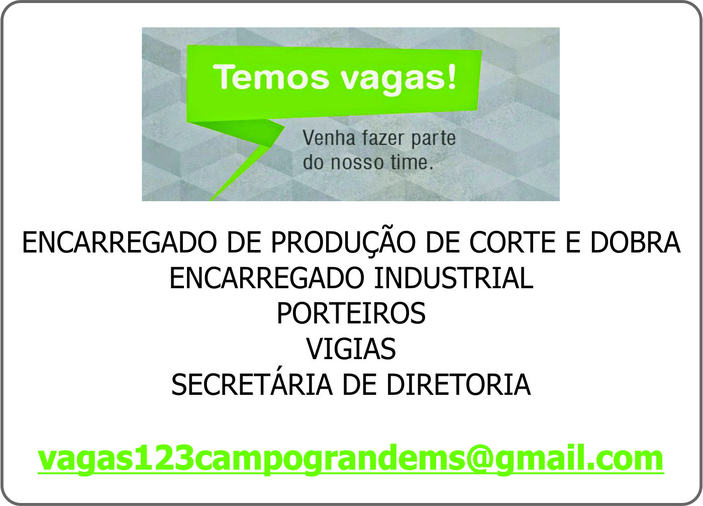 ENCARREGADO DE PRODUÇÃO DE CORTE E DOBRA / ENCARREGADO INDUSTRIAL / PORTEIROS/VIGIAS / SECRETÁRIA DE DIRETORIA