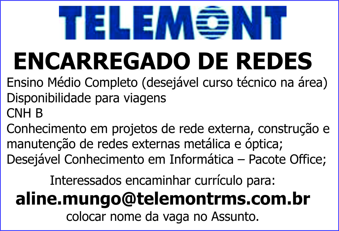 Desejável Conhecimento em Informática – Pacote Office; Enviar currículo: