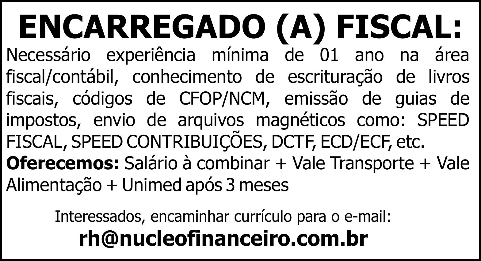 Necessário experiência mínima de 01 ano na área fiscal/contábil, conhecimento de escrituração de livros fiscais, códigos de CFOP/NCM, emissão de guias de impostos, envio de arquivos magnéticos como: SPEED FISCAL, SPEED CONTRIBUIÇÕES, DCTF, ECD/ECF, etc.